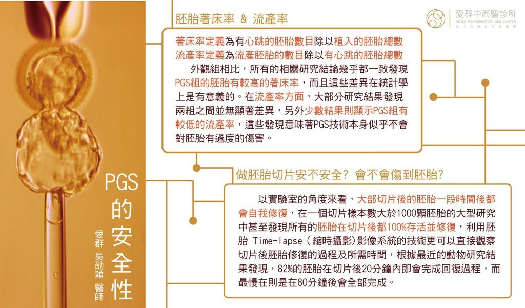 著床率的定義為有心跳的胚胎數目除以植入的胚胎總數,而流產率的定義為流產胚胎的數目除以有心跳的胚胎總數。和外觀組相比,所有的相關研究結論幾乎都一致發現PGS組的胚胎有較高的著床率2,3,4,5,6,而且這些差異在統計學上是有意義的。在流產率方面,大部分研究結果發現兩組之間並無顯著差異2,7,8,9,另外少數結果則顯示 PGS 組有較低的流產率10, 11,這些發現意味著 PGS這個技術本身似乎不會對胚胎有過度的傷害。若是以實驗室的角度來看,大部切片後的胚胎一段時間後都會自我修復。在一個切片樣本數大於1000顆胚胎的大型研究中甚至發現所有的胚胎在切片後都 100% 存活並修復12。最後, 利用胚胎 Time-lapse(縮時攝影)影像系統的技術更可以直接觀察切片後胚胎修復的過程及所需時間。根據最近的動物研究結果發現,82%的胚胎在切片後20分鐘內即會完成回復過程,而最慢在則是在80分鐘後會全部完成13。