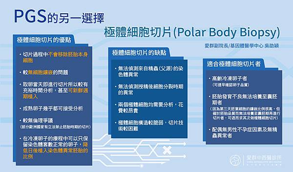 胚胎發育不良無法培養至囊胚期者: 因為第三天胚葉細胞的鑲嵌比例很高,但礙於胚胎品質而無法培養至囊胚期再進行切片者,可退而求其次做極體細胞切片。