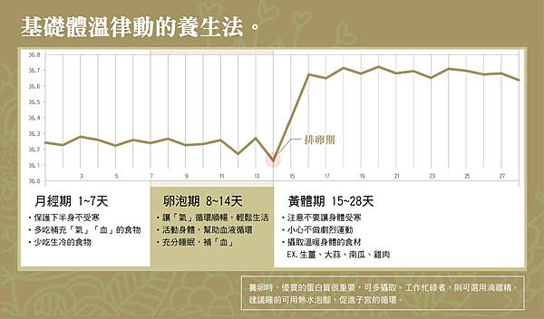 這段時間要溫暖身體,讓受精卵容易著床。若未受孕,體溫會立刻下降,再度進入月經期。食物方面,多吃能夠從體內產生溫暖的生薑、大蒜、南瓜、雞肉等食材。特別注意頸、腰、腳趾要保持溫暖。避免劇烈運動,但是像買東西等日常的活動沒問題。受賀爾蒙平衡的影響,這段時間的精神狀況不穩定,因此不要勉強,放鬆心情生活吧。**