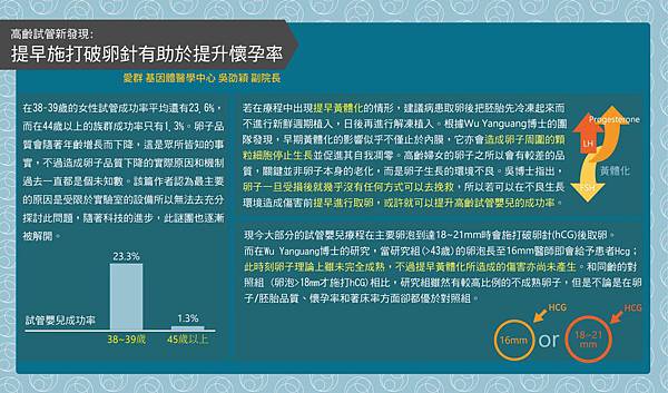 Wu Yanguang 博士認為,過早黃體化對高齡卵子品質的退化過程中有扮演著重要角色,藉由提早取卵可以有效避免該影響,進而提升高齡婦女的試管嬰兒療程的成功率。