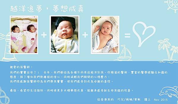 我們很感謝翁醫師你為我們帶來寶寶,使我們感受到成為母親的喜悅。