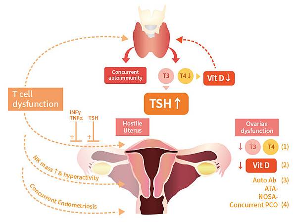 自體免疫性甲狀腺炎常伴隨出現TSH輕微上升,TSH會增加NK cell對IL-2的反應性,促使NK cell增生並加強NK cell的毒殺能力[1],許多研究都指出TSH不僅僅只是觀察甲狀腺功能的指標,對免疫系統也有直接調控的作用,這就是為什麼對於自體免疫性甲狀腺炎的患者投予levothyroxine可幫助懷孕。